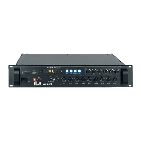 Wöller WZ-6500, yüksek güç gerektiren geniş kapsamlı sabit seslendirme projeleri için tasarlanmış profesyonel bir 100V hat trafolu mikser amplifikatördür. Maksimum 500 Watt çıkış gücü ile AVM’ler, okullar, oteller, hastaneler, ibadethaneler, fabrikalar ve büyük kurumsal yapılarda güçlü, stabil ve kesintisiz performans sunar. 6 bağımsız bölge kontrolü sayesinde her alanın ses seviyesi ayrı ayrı yönetilebilir; böylece çok bölgeli sistemler tek bir cihazla tam kontrol altına alınır. USB/SD Kart ve Bluetooth medya desteği modern cihazlarla kusursuz uyumluluk sağlarken, iki mikrofon girişi duyuru ve etkinlik uygulamalarında geniş kullanım esnekliği sunar. Anons sırasında otomatik müzik kesme ve Ding-Dong ön anons fonksiyonları, duyuruların net ve öncelikli iletilmesini sağlar. Bass, Tiz ve Echo ton kontrolleri ses karakterini ortama göre detaylı biçimde şekillendirme imkânı sunar. Uzaktan kumanda desteği ise geniş yapılarda kullanım kolaylığını artırarak Wöller WZ-6500’ü güçlü, esnek ve kurumsal seslendirme çözümleri için ideal bir tercih haline getirir.